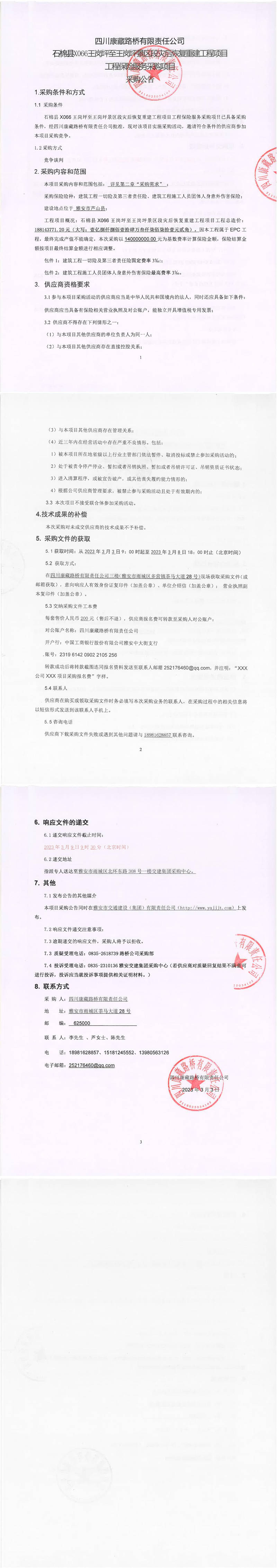 四川康藏路橋有限責(zé)任公司石棉縣X066王崗坪至王崗坪景區(qū)段災(zāi)后恢復(fù)重建工程項(xiàng)目工程保險(xiǎn)服務(wù)采購(gòu)公告