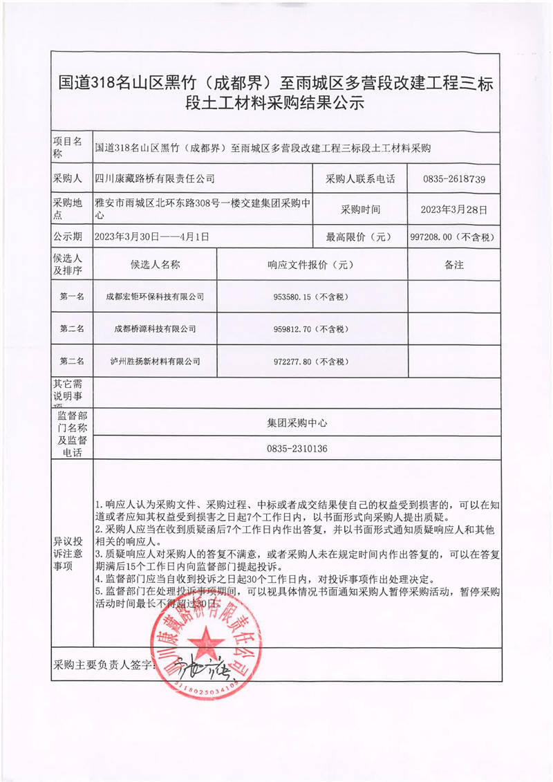 四川康藏路橋有限責(zé)任公司國道318名山區(qū)黑竹(成都界)至雨城區(qū)多營段改建工程三標(biāo)段土工材料采購結(jié)果公示