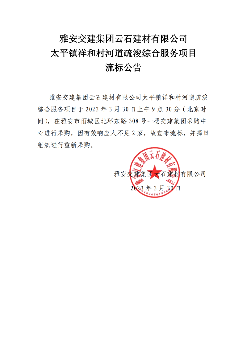 雅安交建集團云石建材有限公司太平鎮(zhèn)祥和村河道疏浚綜合服務項目流標通知
