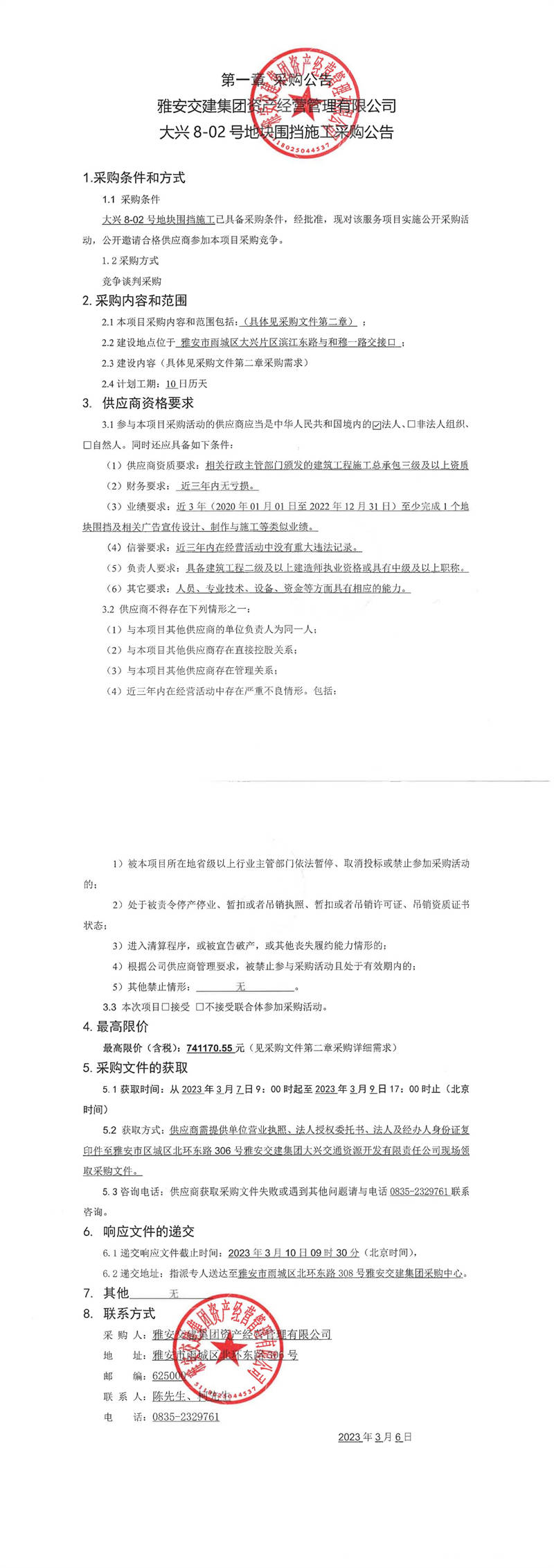 雅安交建集團(tuán)資產(chǎn)經(jīng)營管理有限公司大興8-02號地塊圍擋施工采購公告
