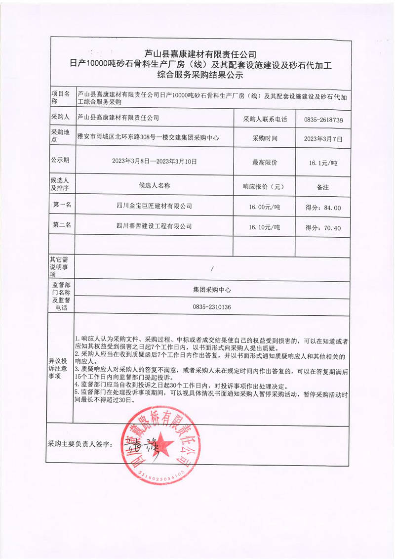 蘆山縣嘉康嘉康建材有限責(zé)任公司日產(chǎn)10000噸砂石骨料生產(chǎn)廠房(線)及其配套設(shè)施建設(shè)及砂石代加工綜合服務(wù)采購(gòu)結(jié)果公示
