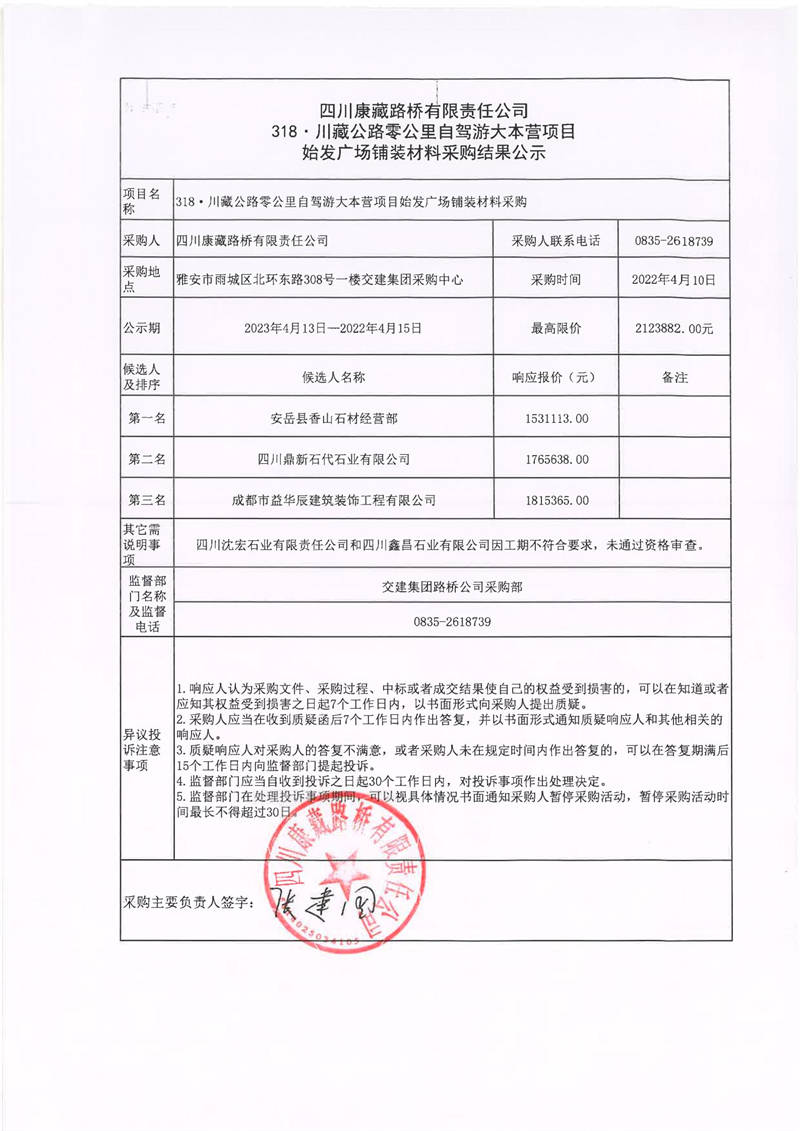 四川康藏路橋有限責任公司318·川藏公路零公里自駕游大本營項目始發(fā)廣場鋪裝材料采購結(jié)果公示