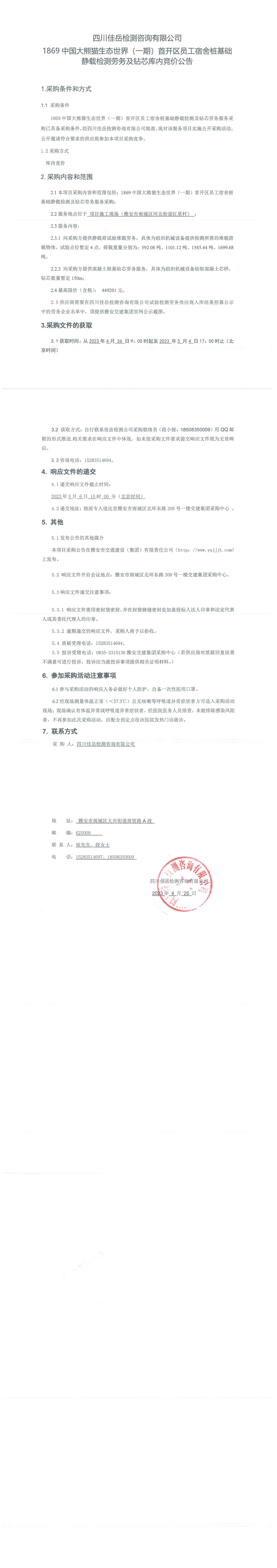 四川佳岳檢測(cè)咨詢有限公司1869中國(guó)大熊貓生態(tài)世界(一期)首開區(qū)員工宿舍樁基礎(chǔ)靜載檢測(cè)勞務(wù)及磚芯庫內(nèi)競(jìng)價(jià)公告