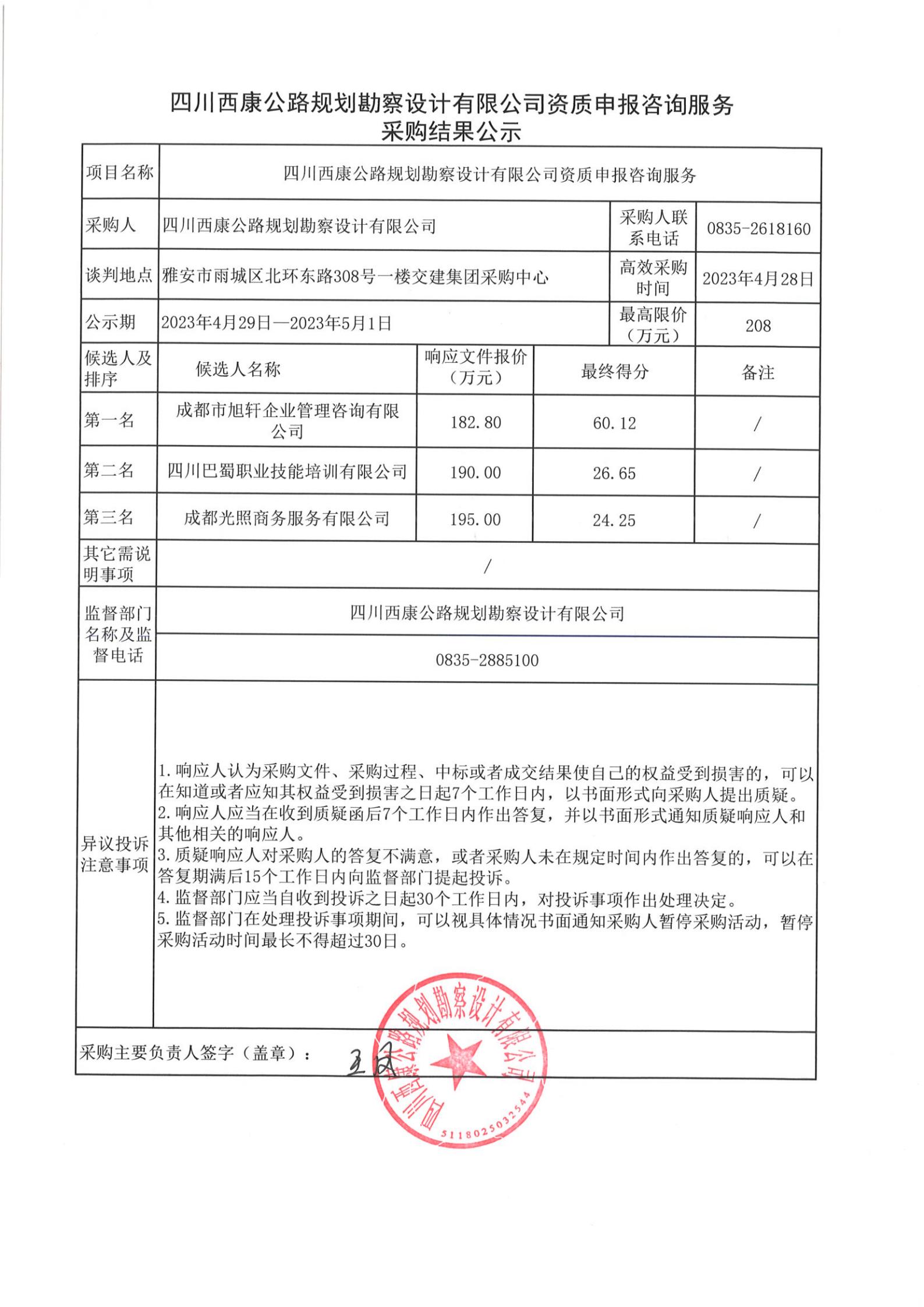 四川西康公路規(guī)劃勘察設計有限公司資質申報咨詢服務采購結果公示