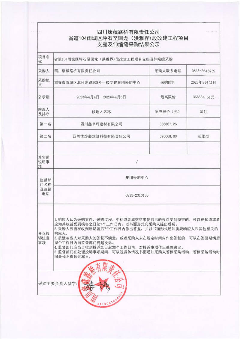 四川康藏路橋有限責(zé)任公司省道104雨城區(qū)坪石至回龍(洪雅界)段改建工程項(xiàng)目支座及伸縮縫采購(gòu)結(jié)果公示