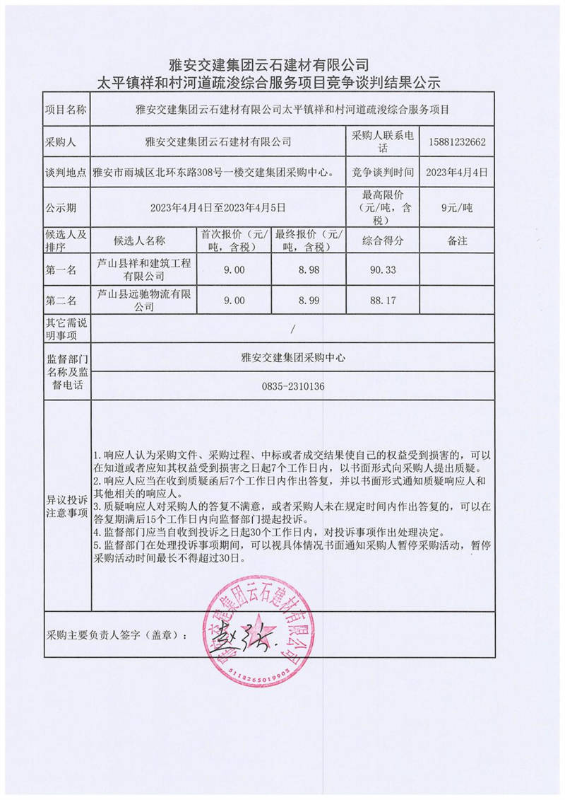 雅安交建集團(tuán)云石建材有限公司太平鎮(zhèn)祥和村河道疏浚綜合服務(wù)項(xiàng)目競(jìng)爭(zhēng)談判結(jié)果公示