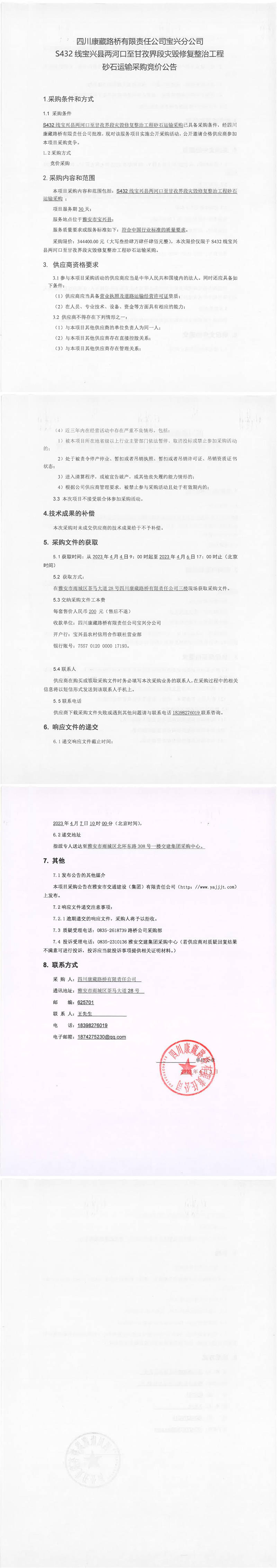 四川康藏路橋有限責(zé)任公司寶興分公司S432寶興縣兩河口至甘孜界段災(zāi)毀修復(fù)整治工程砂石運輸采購競價公告