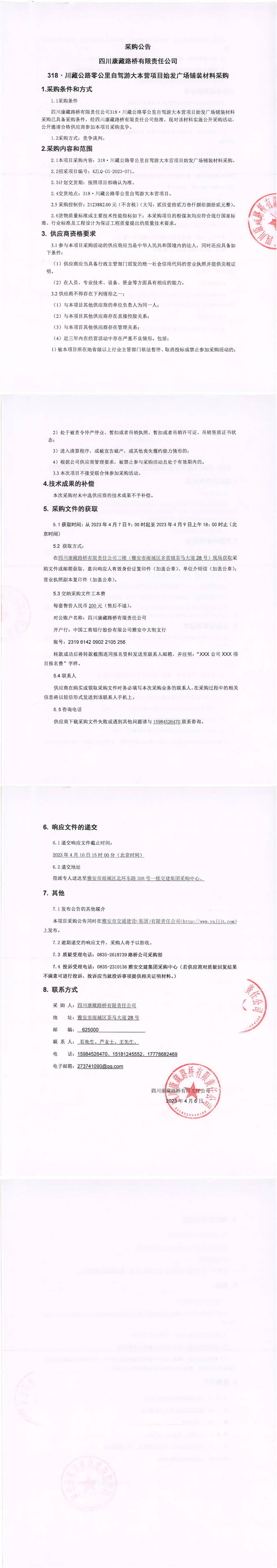 四川康藏路橋有限責任公司318·川藏公路零公里自駕游大本營項目始發(fā)廣場鋪裝材料采購公告