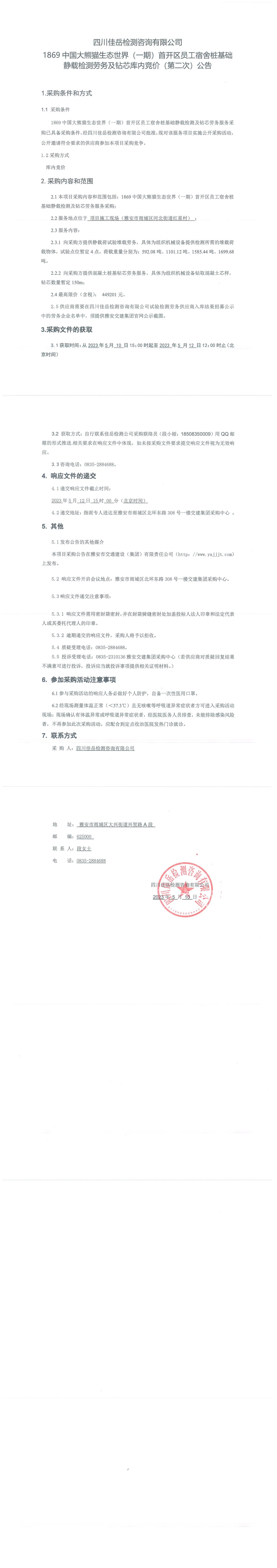 四川佳岳檢測(cè)咨詢有限公司1869中國(guó)大熊貓生態(tài)世界(一期)首開區(qū)員工宿舍樁基礎(chǔ)靜載檢測(cè)勞務(wù)及磚芯庫(kù)內(nèi)競(jìng)價(jià)(第二次)采購(gòu)公告