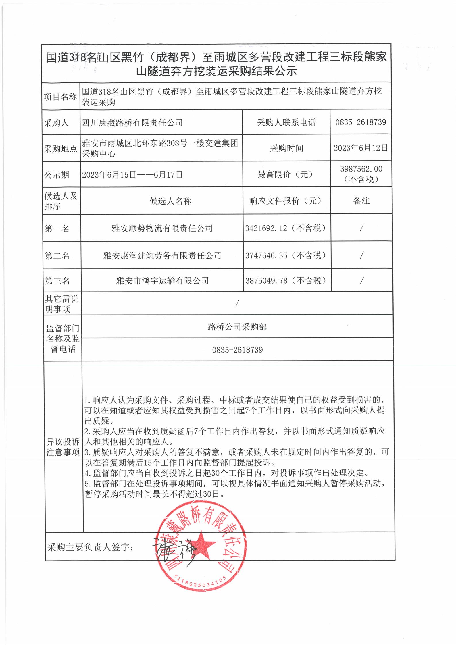 四川康藏路橋有限責(zé)任公司國(guó)道318名山區(qū)黑竹(成都界)至雨城區(qū)多營(yíng)段改建工程三標(biāo)段熊家山隧道棄方挖裝運(yùn)采購(gòu)結(jié)果公示