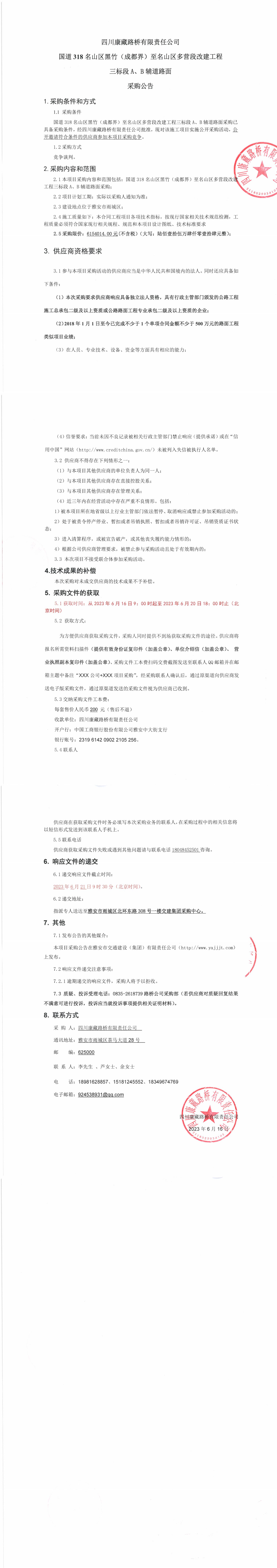 四川康藏路橋有限責(zé)任公司國(guó)道318名山區(qū)黑竹(成都界)至名山區(qū)多營(yíng)段改建工程三標(biāo)段A,B輔道路面采購(gòu)公告