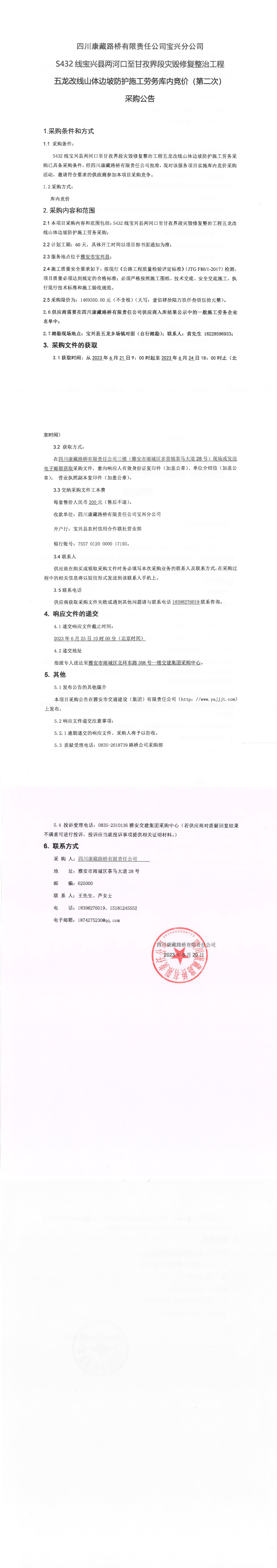四川康藏路橋有限責(zé)任公司寶興分公司S432線寶興縣兩河口至甘孜界段災(zāi)毀修復(fù)整治工程五龍改線山體邊坡防護(hù)施工勞務(wù)庫內(nèi)競價(第二次)采購公告