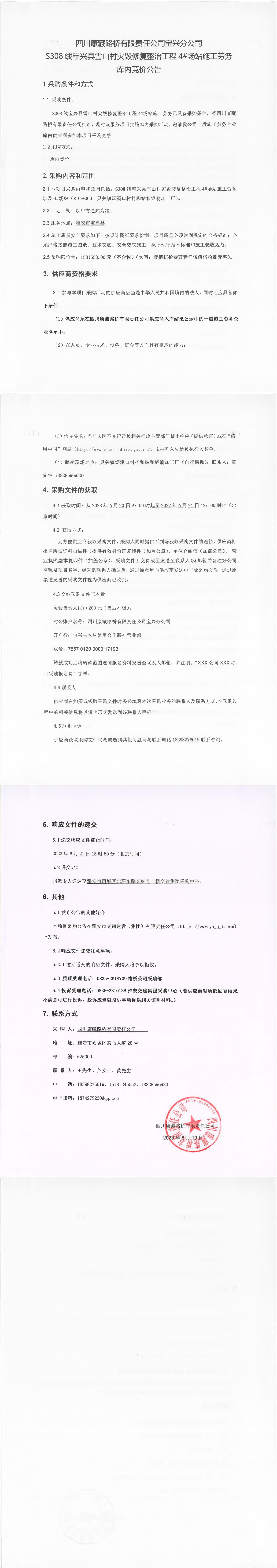 四川康藏路橋有限責任公司寶興分公司S308線寶興縣雪山村災毀整治工程4#場站施工勞務庫內競價公告