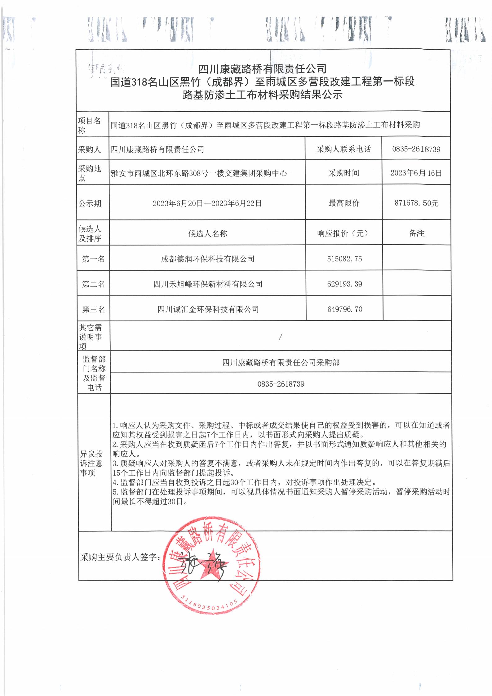 四川康藏路橋有限責(zé)任公司國(guó)道318名山區(qū)黑竹(成都界)至雨城區(qū)多營(yíng)段改建工程第一標(biāo)段路基防滲土工布材料采購(gòu)結(jié)果公示