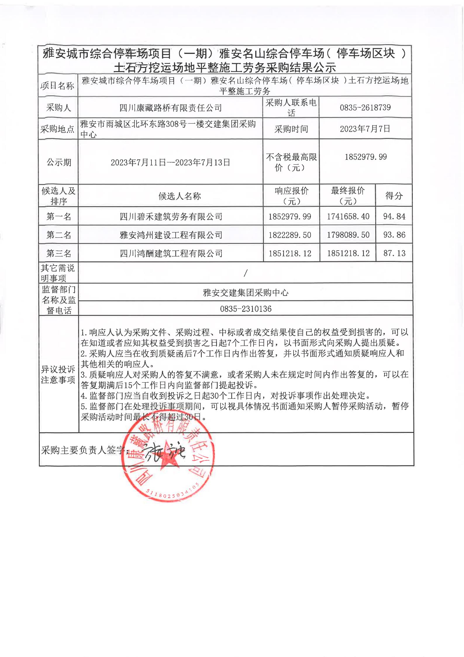 四川康藏路橋有限責(zé)任公司雅安城市綜合停車(chē)場(chǎng)項(xiàng)目(一期)雅安名山綜合停車(chē)場(chǎng)(停車(chē)場(chǎng)區(qū)塊)土石方挖運(yùn)場(chǎng)地平整施工勞務(wù)采購(gòu)結(jié)果公示