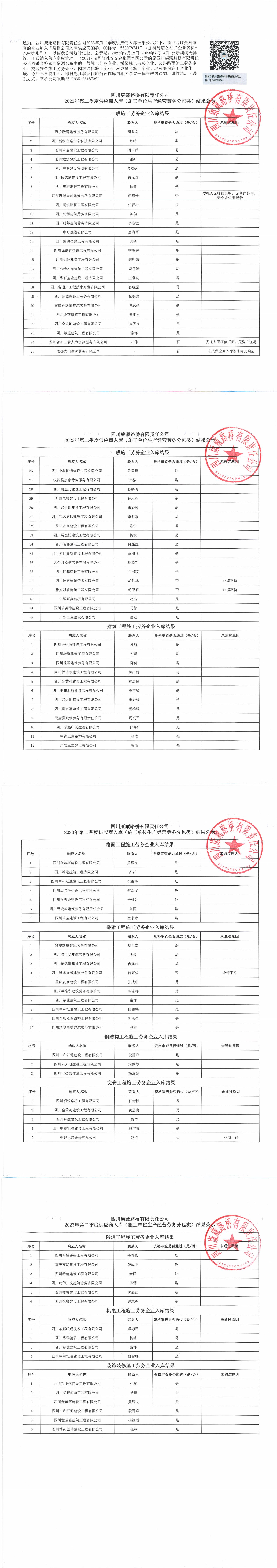 四川康藏路橋有限責(zé)任公司2023年第二季度供應(yīng)商入庫(kù)(施工單位生產(chǎn)經(jīng)營(yíng)勞務(wù)分包類)結(jié)果公示