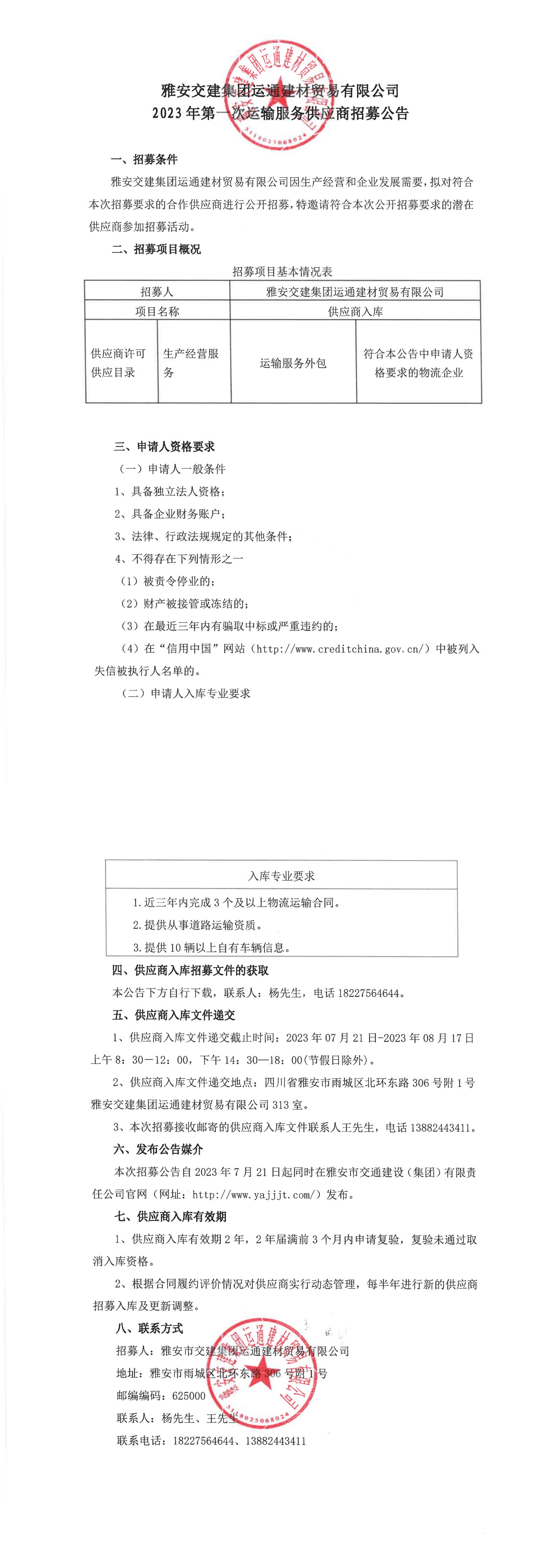 雅安交建集團(tuán)運(yùn)通建材貿(mào)易有限公司2023年第一次運(yùn)輸服務(wù)供應(yīng)商招募公告