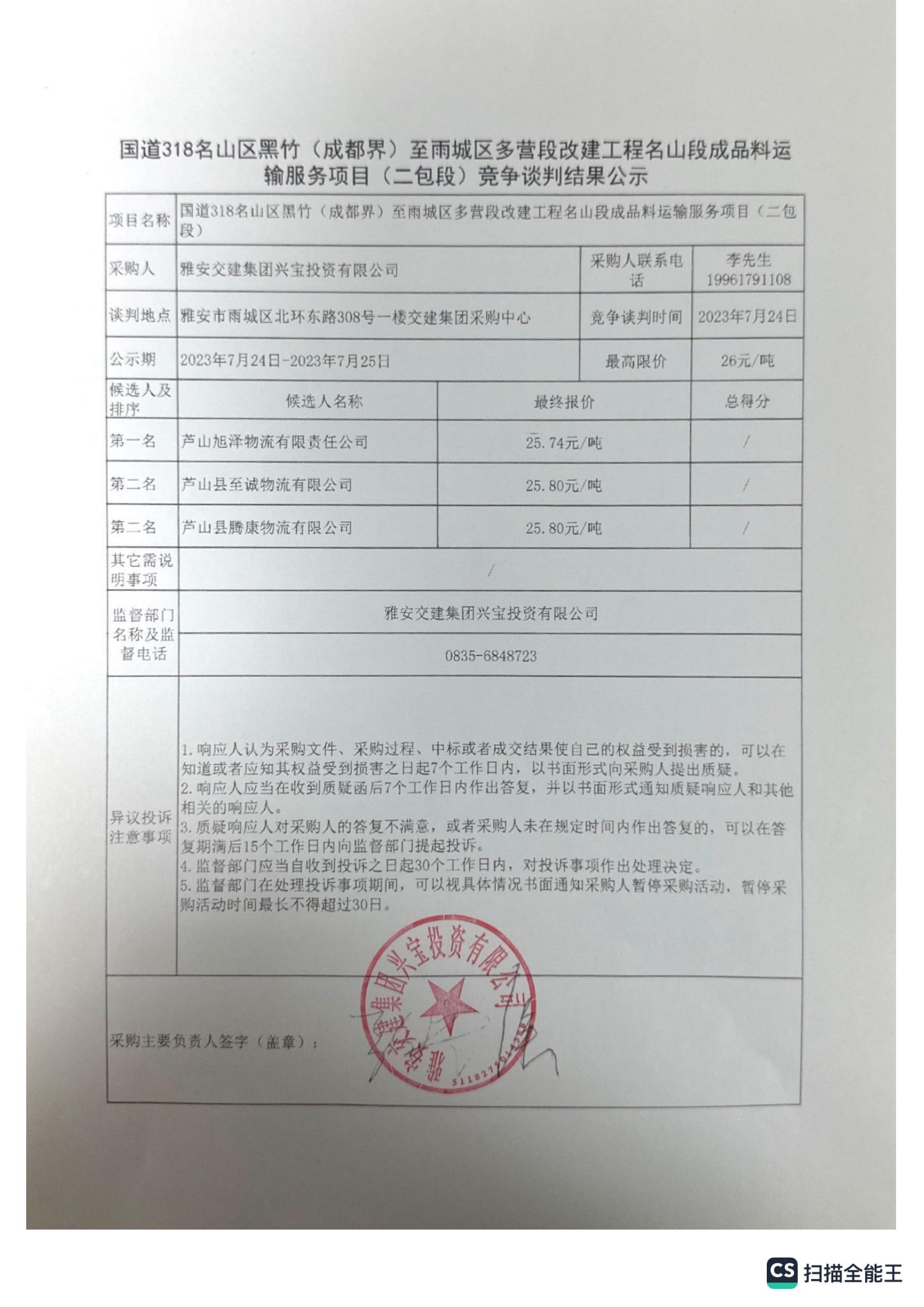 雅安交建集團興寶投資有限公司國道318名山區(qū)黑竹(成都界)至雨城區(qū)多營段改建工程名山段成品料運輸服務項目(二包段)競爭談判結果公示