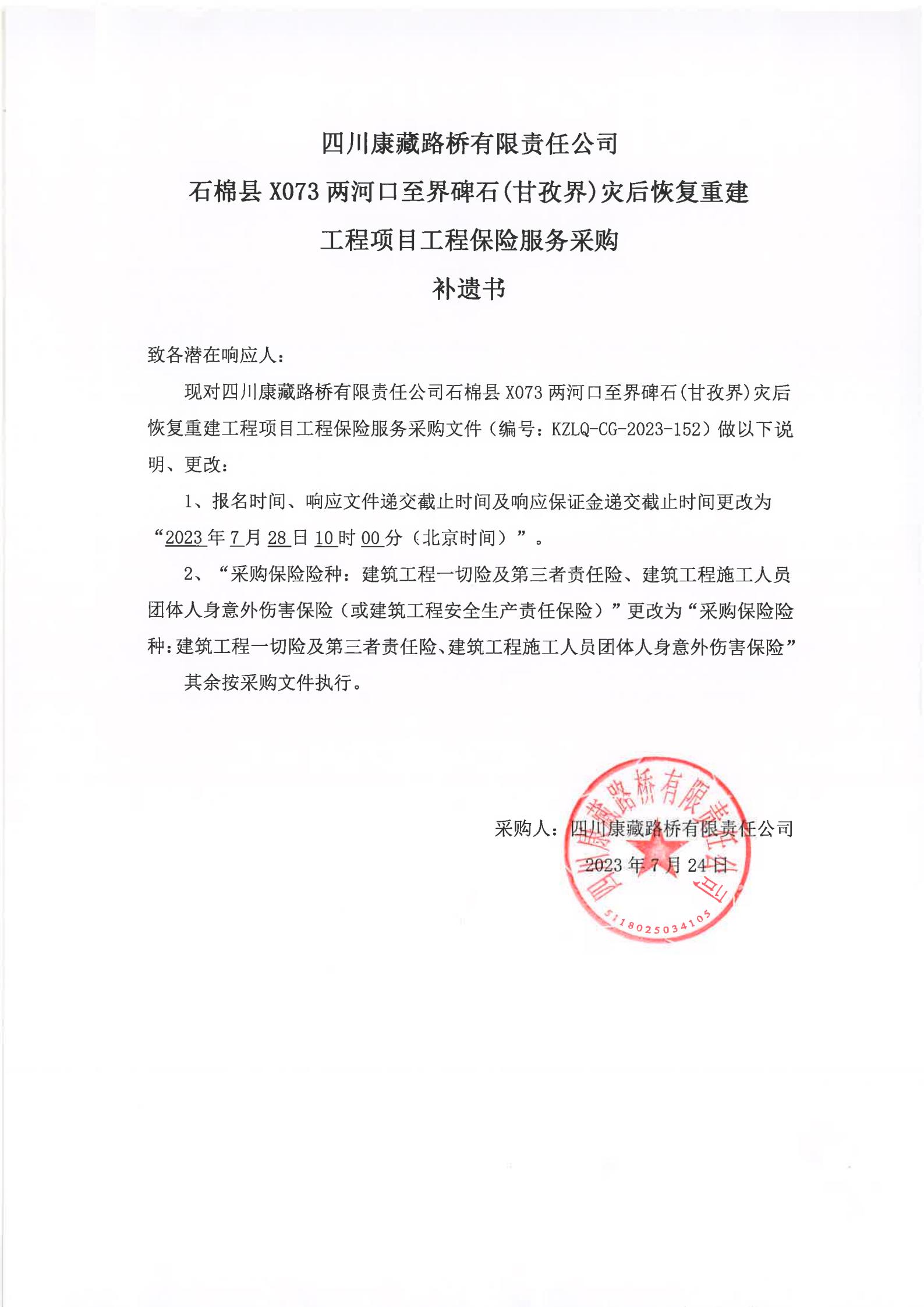 四川康藏路橋有限責(zé)任公司石棉縣X073兩河口至界碑石(甘孜界)災(zāi)后恢復(fù)重建工程項(xiàng)目工程保險(xiǎn)服務(wù)采購(gòu)補(bǔ)遺書(shū)