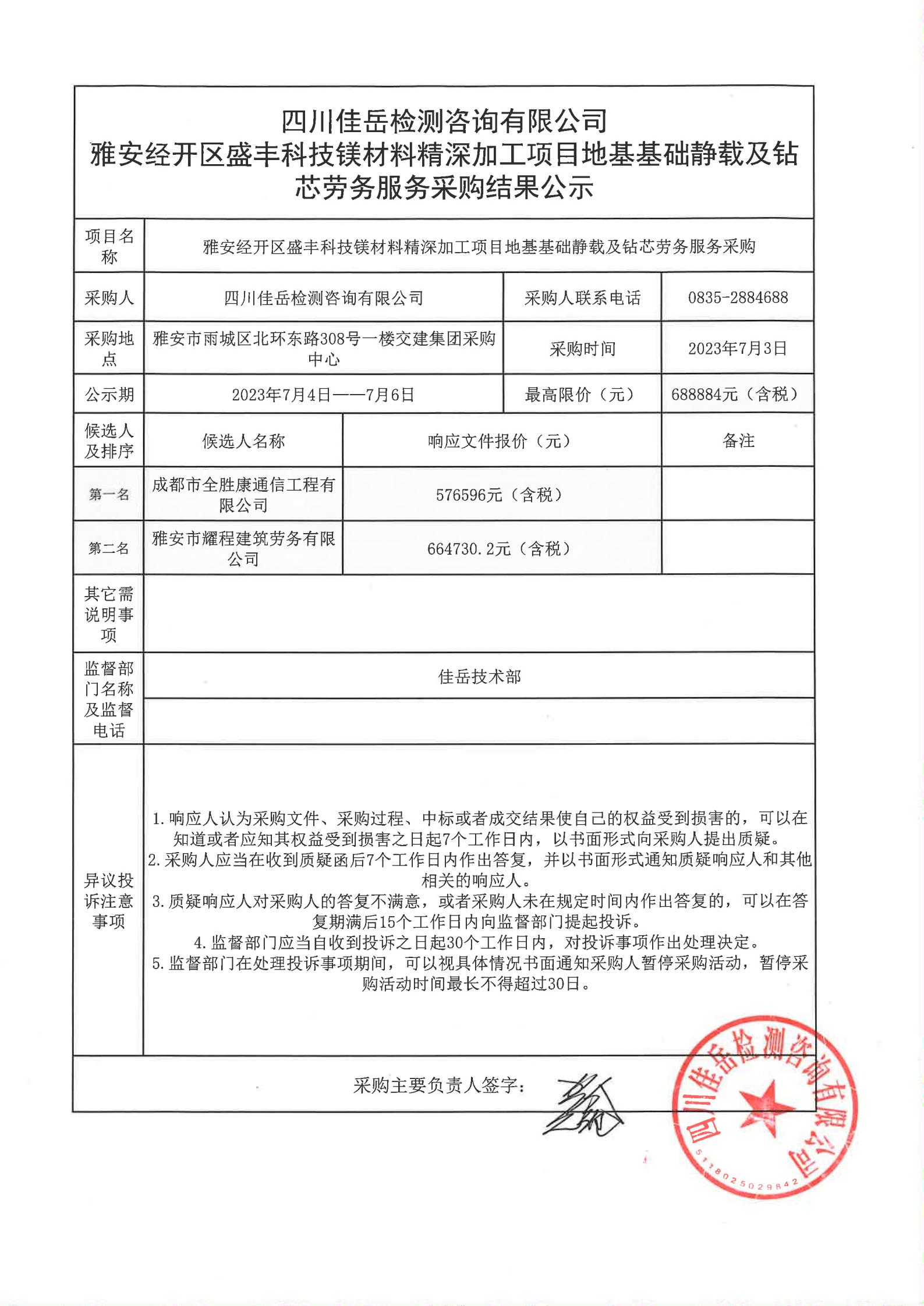 四川佳岳檢測咨詢有限公司雅安經(jīng)開區(qū)盛豐科技鎂材料精深加工項目地基基礎靜載及鉆芯服務采購結(jié)果公示