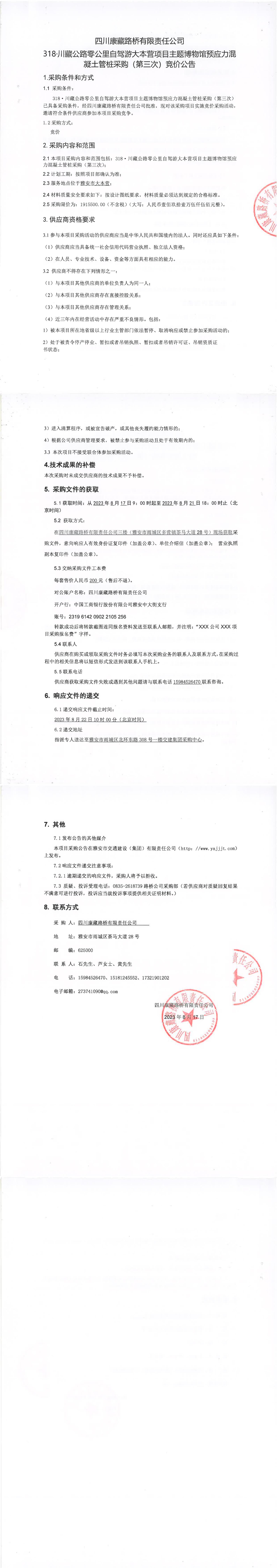 四川康藏路橋有限責任公司318·川藏公路零公里自駕游大本營項目主題博物館預(yù)應(yīng)力混凝土管樁采購(第三次)競價公告