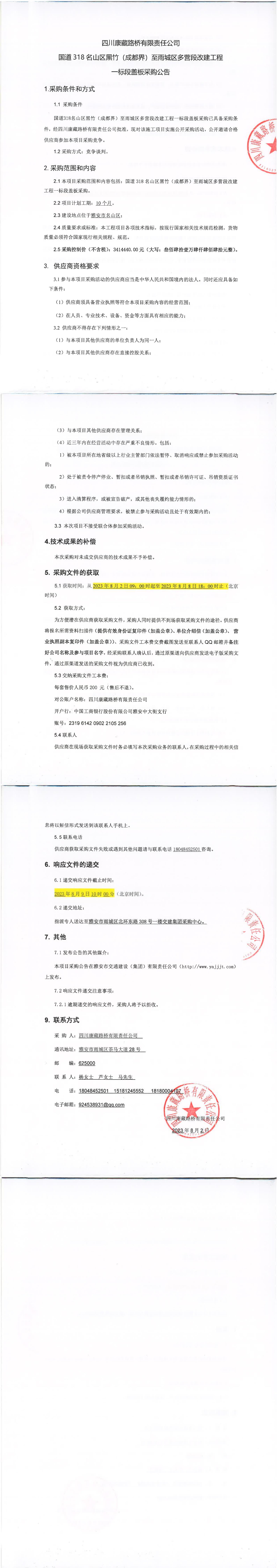 四川康藏路橋有限責(zé)任公司國道318名山區(qū)黑竹(成都界)至雨城區(qū)多營段改建工程一標(biāo)段蓋板采購公告