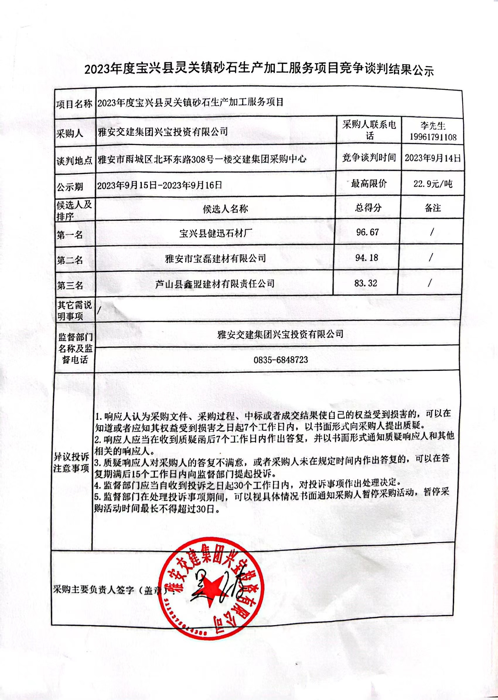 雅安交建集團(tuán)興寶投資有限公司2023年度寶興縣靈關(guān)鎮(zhèn)砂石生產(chǎn)加工服務(wù)項(xiàng)目競爭談判結(jié)果公示
