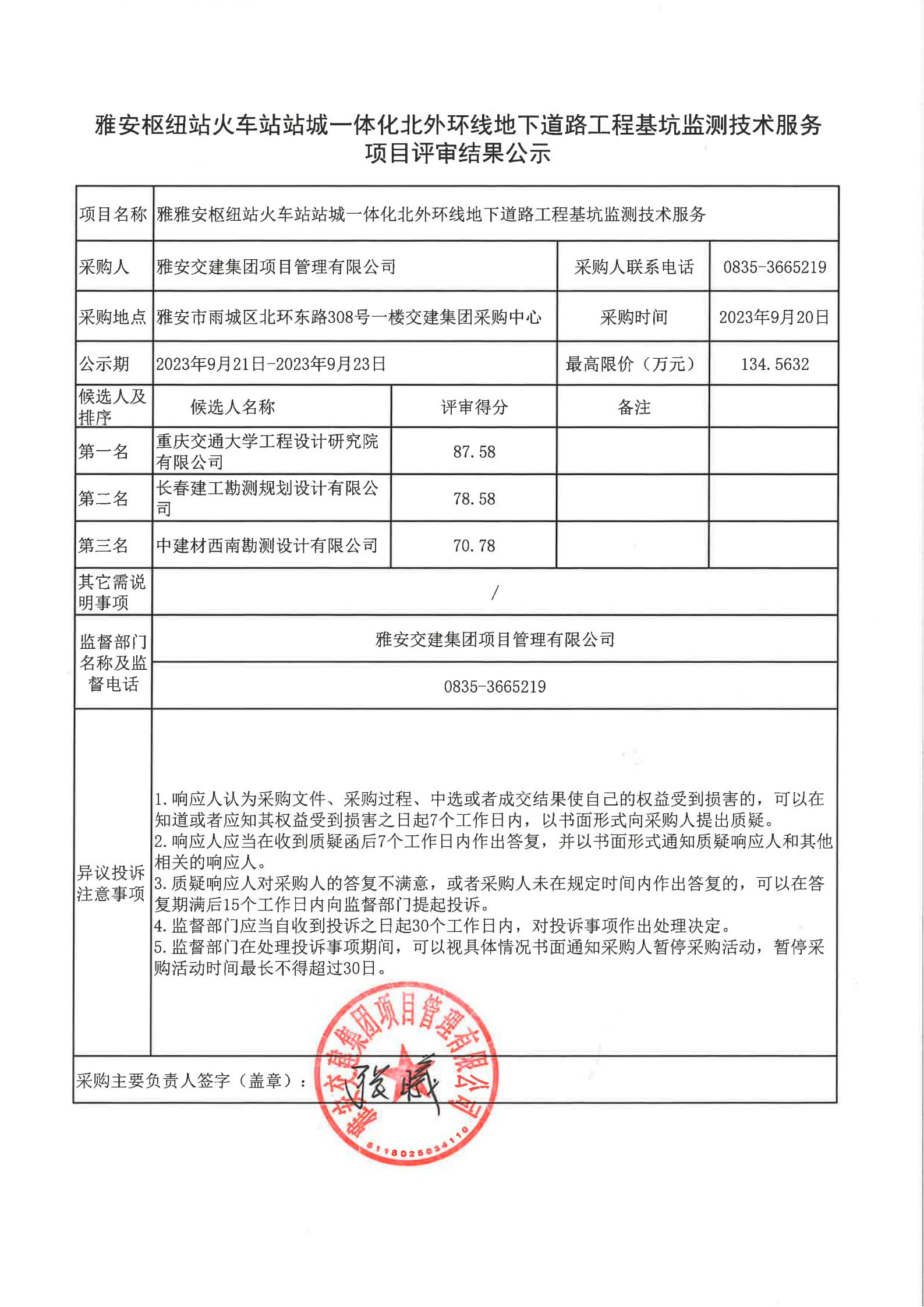 雅安交建集團(tuán)項目管理有限公司雅安樞紐站火車站站城一體化北外環(huán)線地下道路工程基坑監(jiān)測技術(shù)服務(wù)項目評審結(jié)果公示
