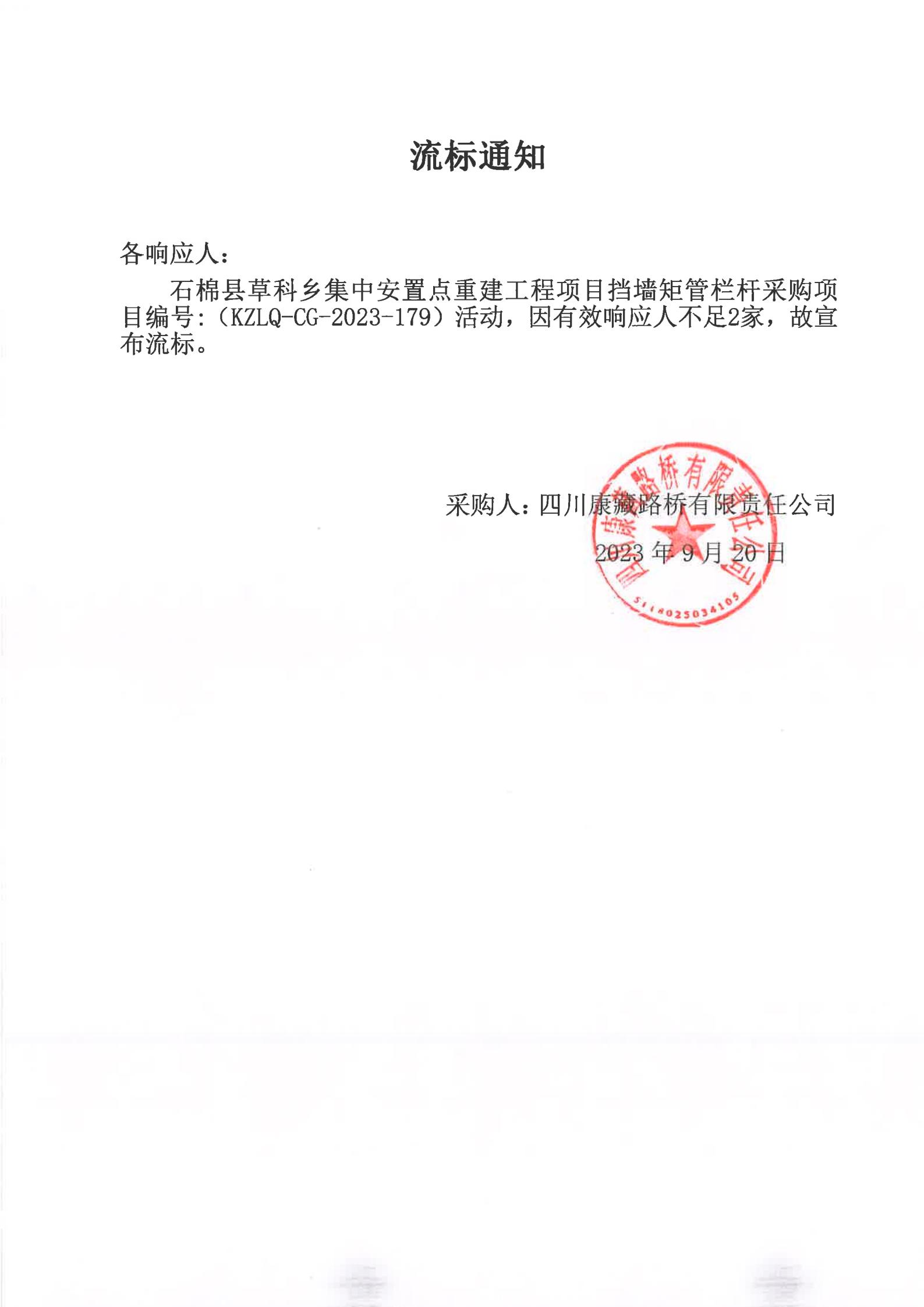 四川康藏路橋有限責(zé)任公司石棉草科鄉(xiāng)集中安置點(diǎn)重建工程項(xiàng)目擋墻矩管欄桿采購(gòu)項(xiàng)目流標(biāo)通知