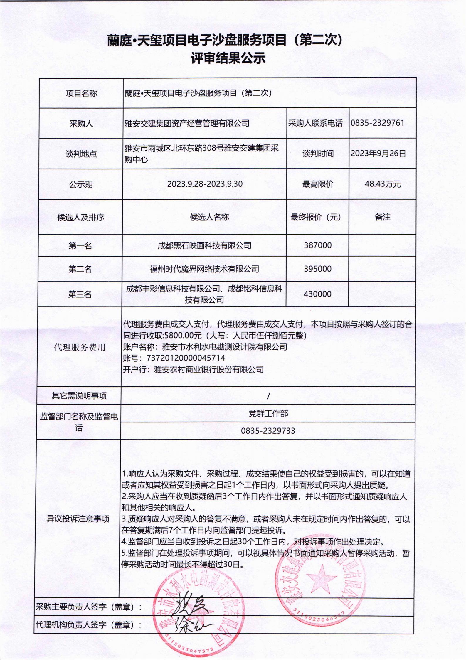 雅安交建集團(tuán)資產(chǎn)經(jīng)營(yíng)管理有限公司蘭庭•天璽項(xiàng)目電子沙盤服務(wù)項(xiàng)目(第二次)評(píng)審結(jié)果公示