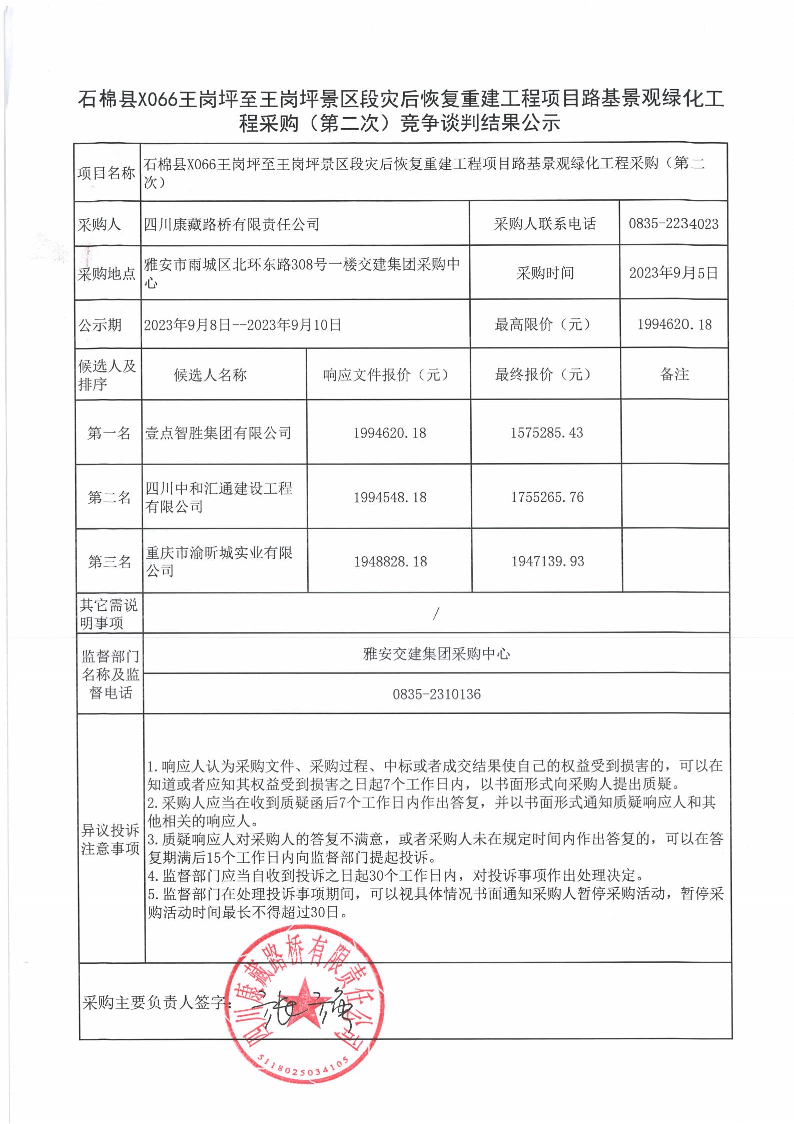 四川康藏路橋有限責任公司石棉縣X066王崗坪至王崗坪景區(qū)段災后恢復重建工程項目路基景觀綠化工程施工采購(第二次)競爭談判結果公示