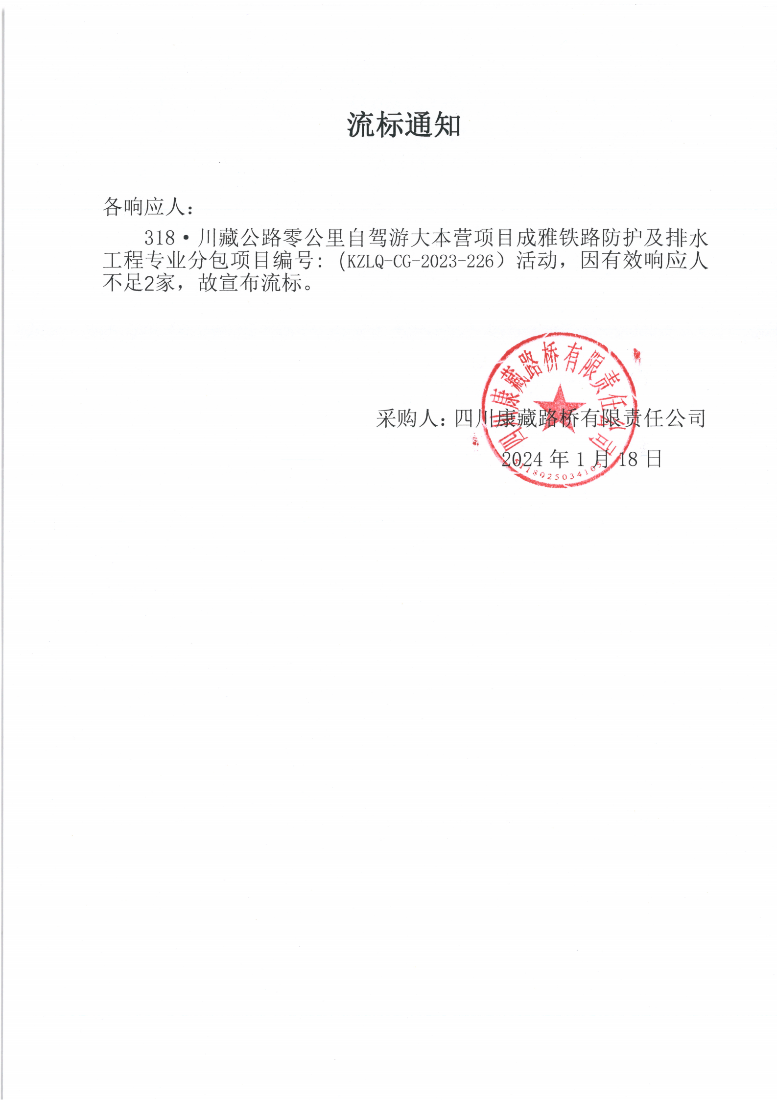四川康藏路橋有限責(zé)任公司318·川藏公路零公里自駕游大本營項目成雅鐵路防護(hù)及排水工程專業(yè)分包項目流標(biāo)通知