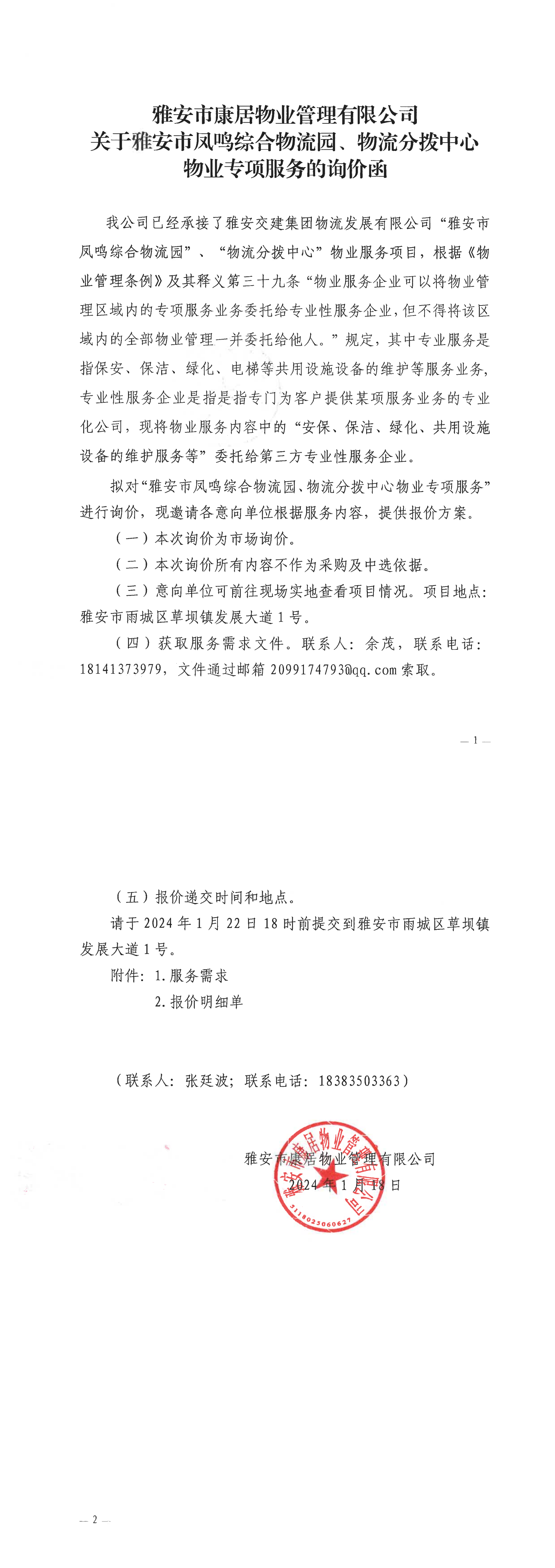 雅安市康居物業(yè)管理有限公司關(guān)于雅安市鳳鳴綜合物流園、物流分撥中心物業(yè)專項服務(wù)的詢價函