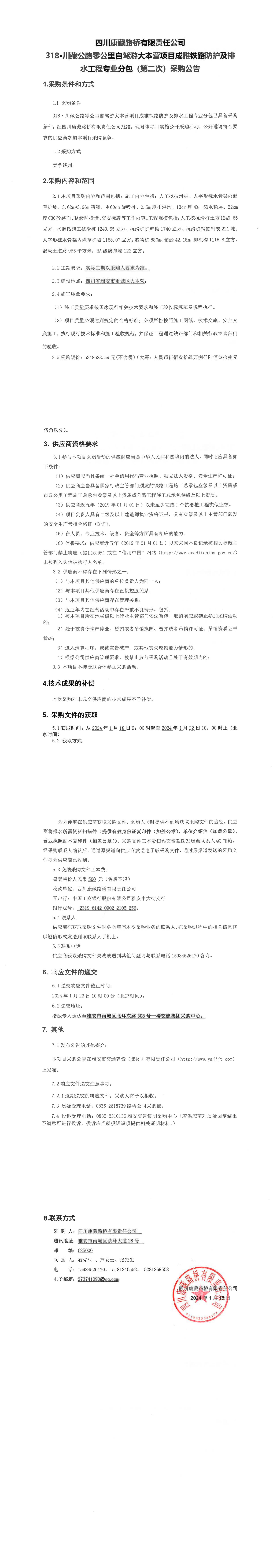 四川康藏路橋有限責(zé)任公司318·川藏公路零公里自駕游大本營項(xiàng)目成雅鐵路防護(hù)及排水工程專業(yè)分包(第二次)采購公告