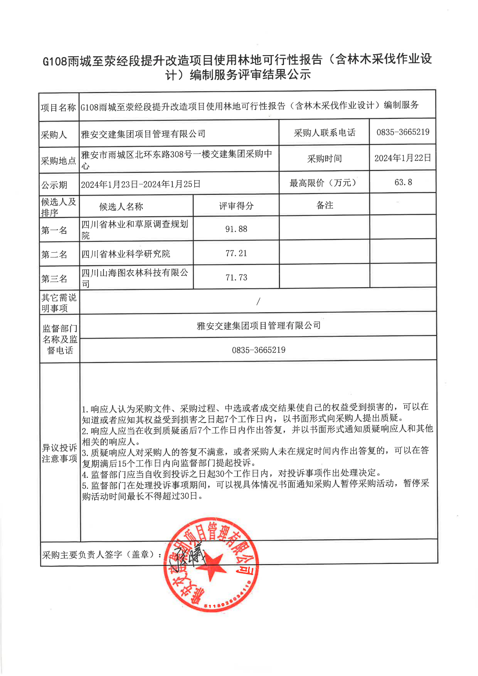 雅安交建集團項目管理有限公司G108雨城至滎經(jīng)段提升改造項目使用林地可行性報告(含林木采伐作業(yè)設(shè)計)編制服務(wù)評審結(jié)果公示