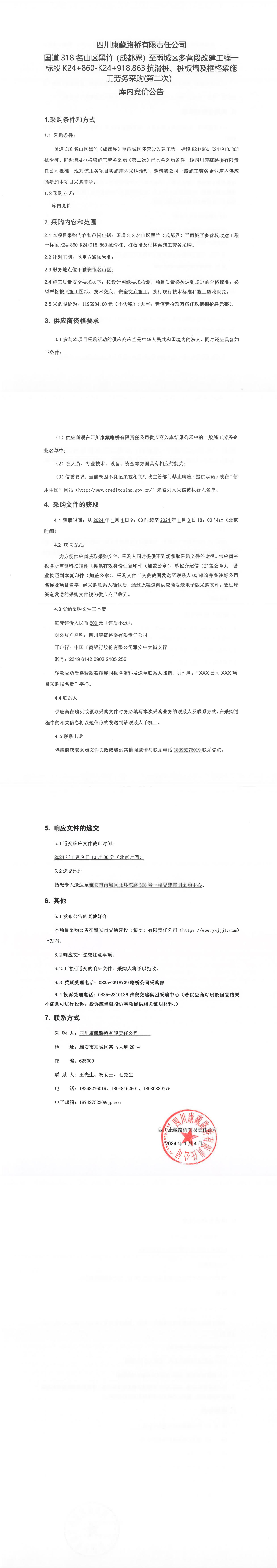 四川康藏路橋有限責(zé)任公司國道318名山區(qū)黑竹(成都界)至雨城區(qū)多營段改建工程一標(biāo)段K24+860-K24+918.863抗滑樁、樁板墻及框格梁施工勞務(wù)采購(第二次)庫內(nèi)競價(jià)公告