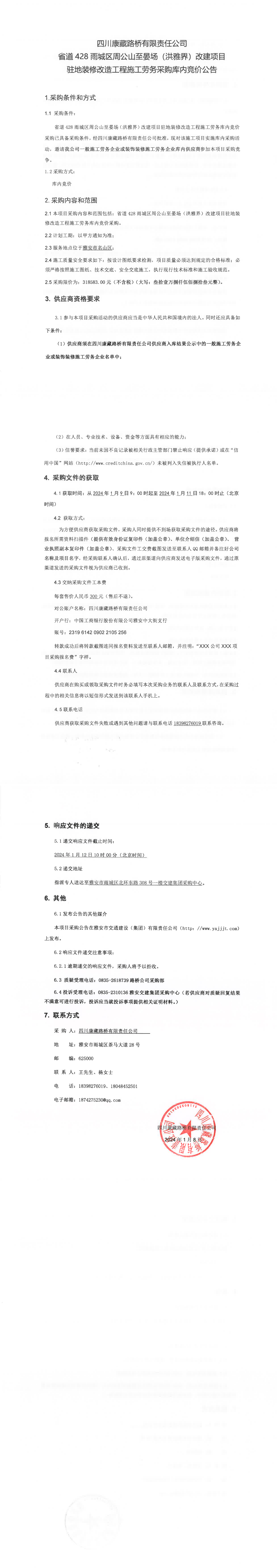 四川康藏路橋有限責任公司省道428雨城區(qū)周公山至晏場(洪雅界)改建項目駐地裝修改造工程施工勞務(wù)采購庫內(nèi)競價公告