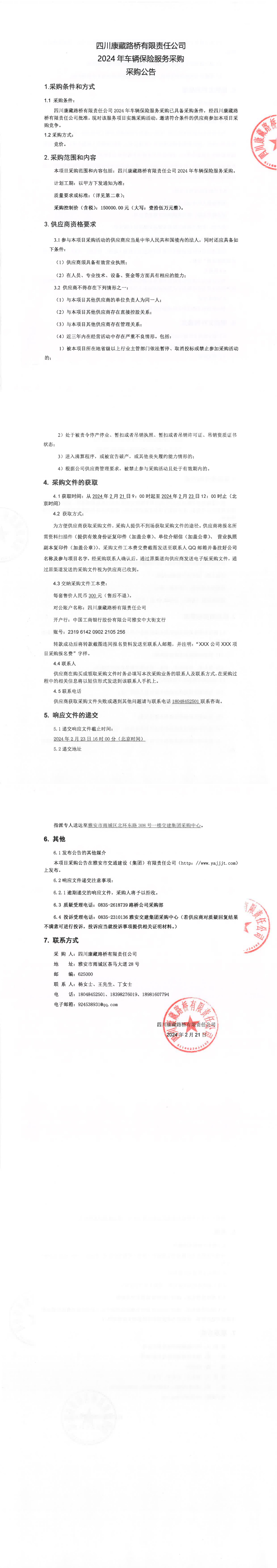 四川康藏路橋有限責任公司2024年車輛保險服務采購公告