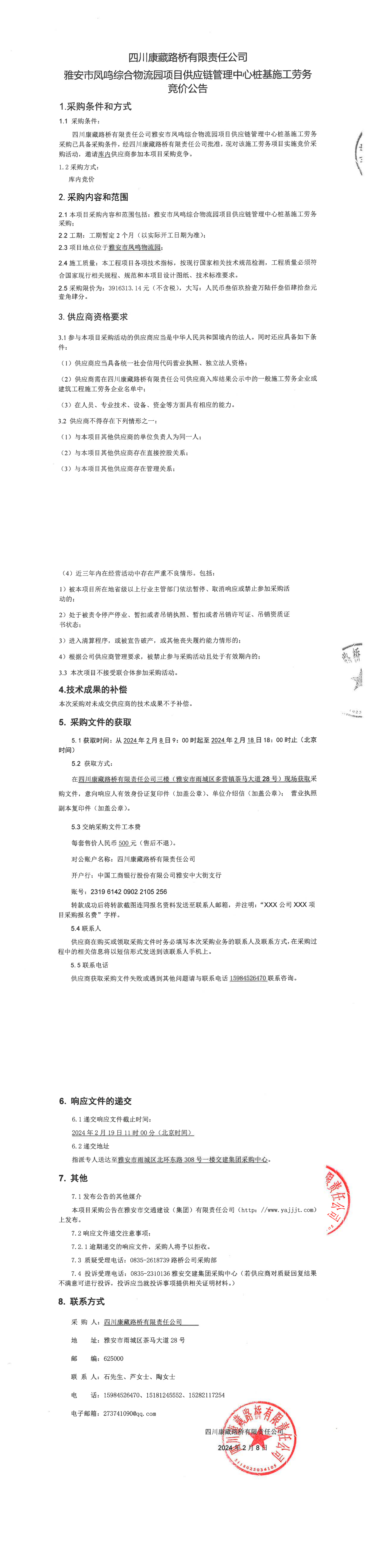 四川康藏路橋有限責任公司雅安市鳳鳴綜合物流園項目供應(yīng)鏈管理中心樁基施工勞務(wù)采購公告