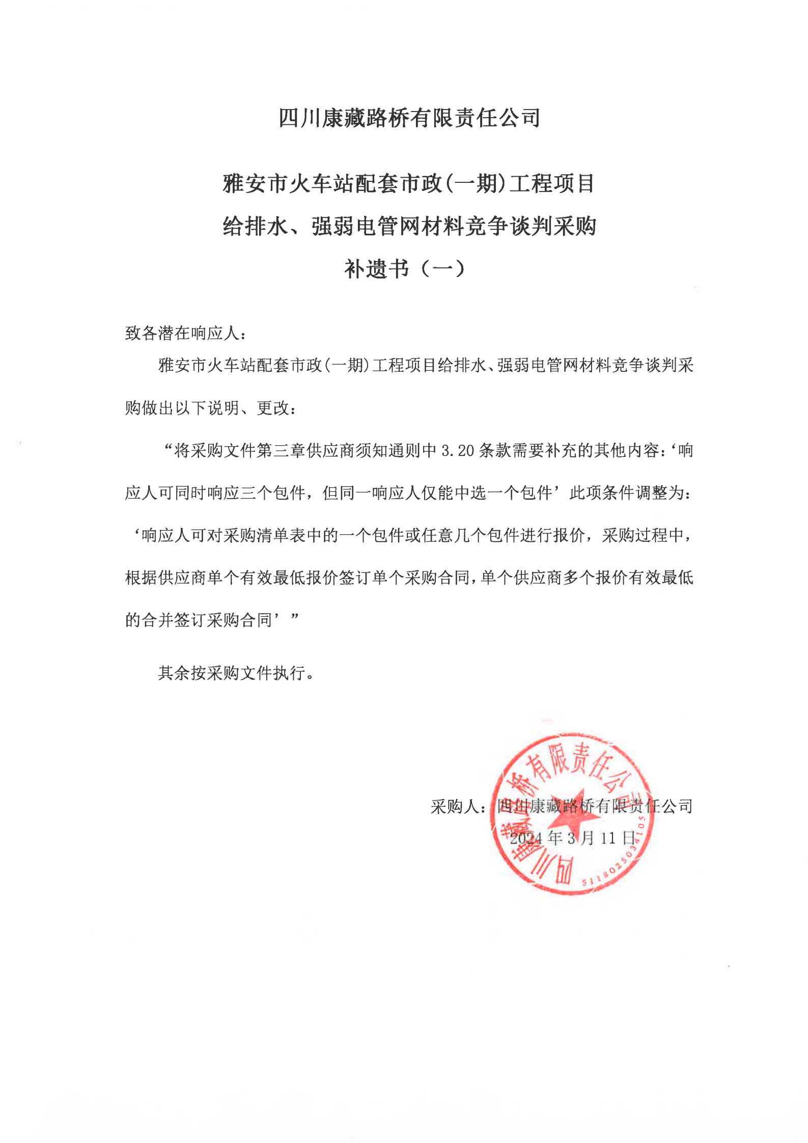 四川康藏路橋有限責(zé)任公司雅安市火車站配套市政(一期)工程項(xiàng)目給排水、強(qiáng)弱電管網(wǎng)材料競(jìng)爭(zhēng)談判采購(gòu)補(bǔ)遺書
