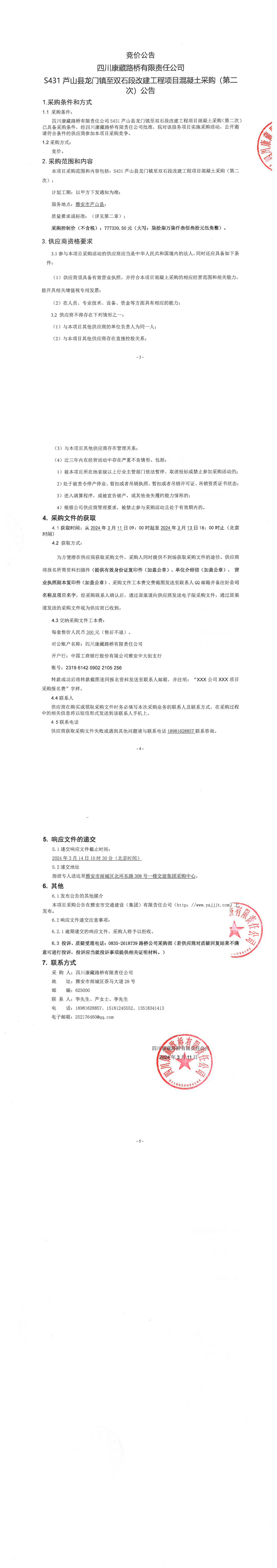 四川康藏路橋有限責(zé)任公司S431蘆山縣龍門鎮(zhèn)至雙石段改建工程項(xiàng)目混凝土采購(gòu)(第二次)公告
