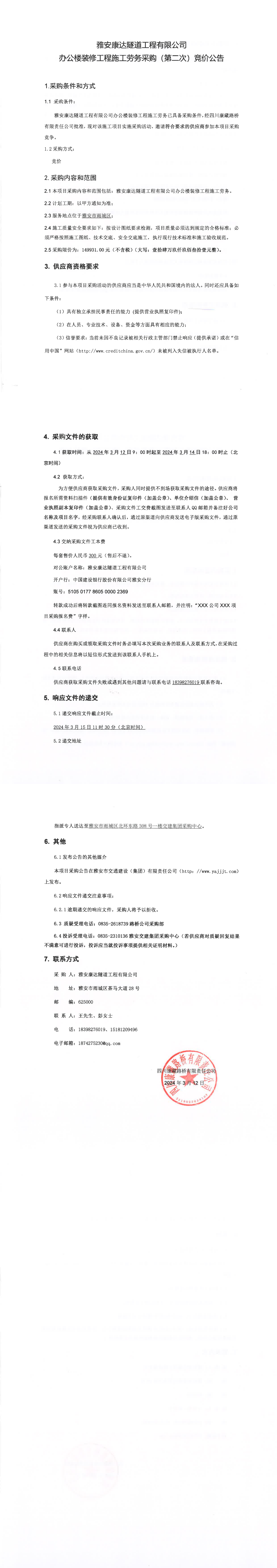 雅安康達隧道工程有限公司辦公樓裝修工程施工勞務競價采購(第二次)公告