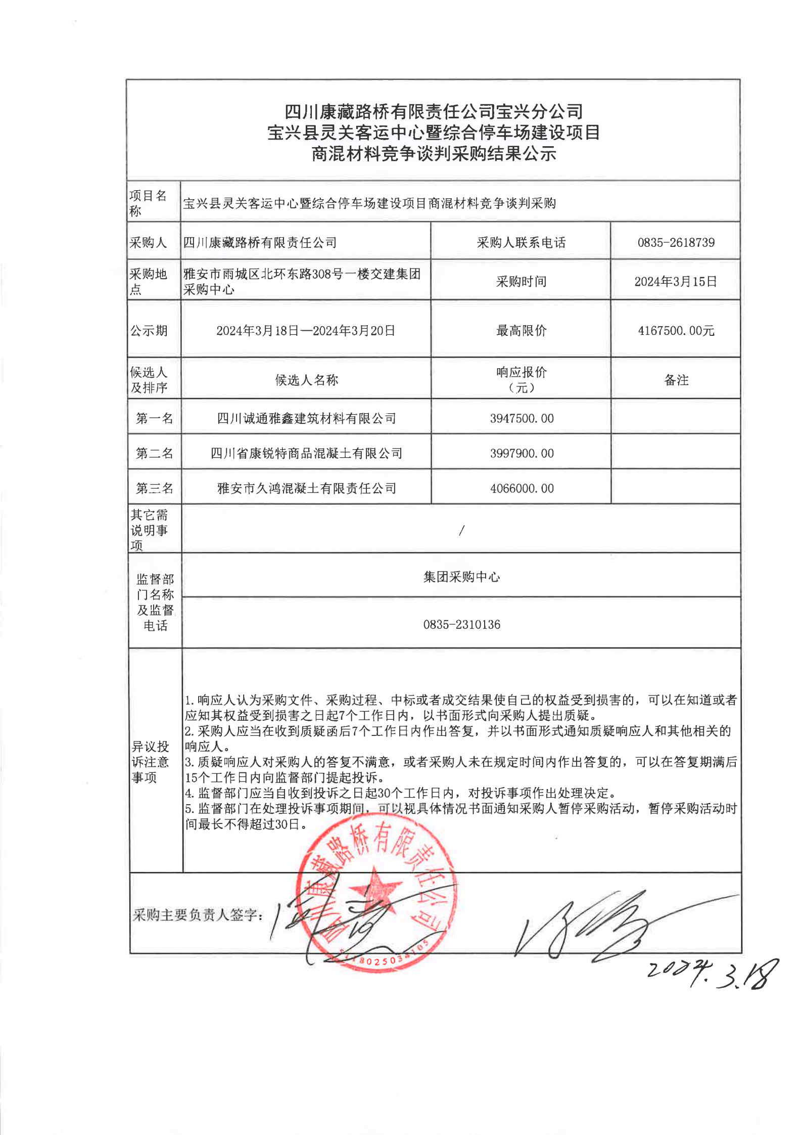 四川康藏路橋有限責任公司寶興分公司寶興縣靈關客運中心暨綜合停車場建設項目商混材料競爭談判采購結果公示