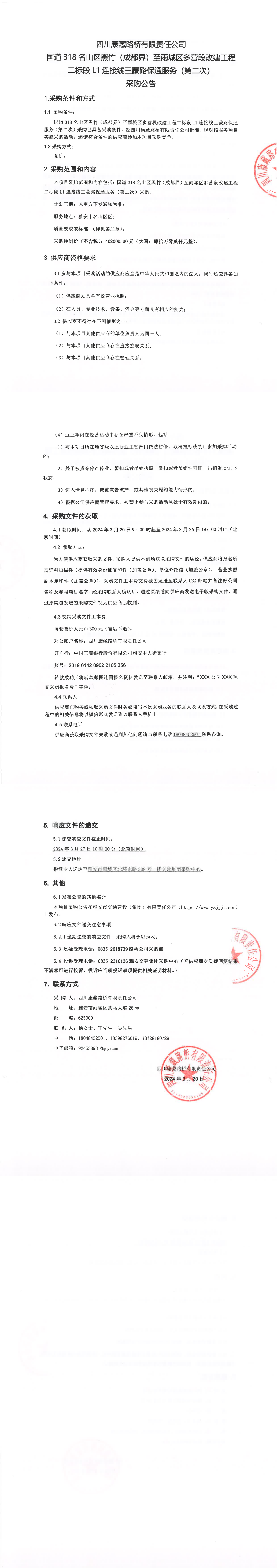 四川康藏路橋有限責(zé)任公司國道318名山區(qū)黑竹(成都界)至雨城區(qū)多營段改建工程二標(biāo)段L1連接線三蒙路保通服務(wù)(第二次)采購公告