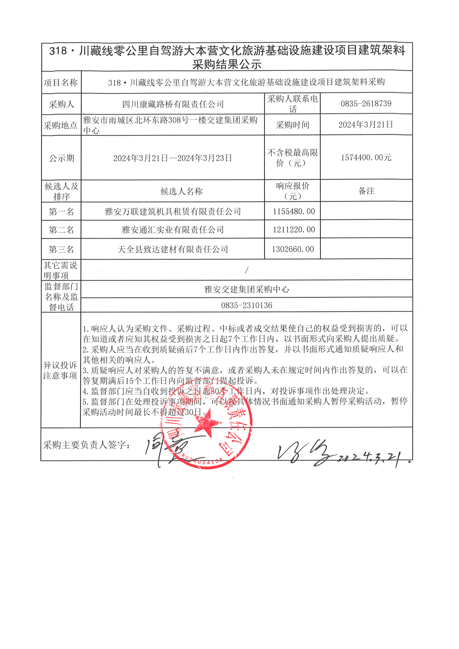 四川康藏路橋有限責任公司318·川藏線零公里自駕游大本營文化旅游基礎設施建設項目建筑架料租賃采購結果公示