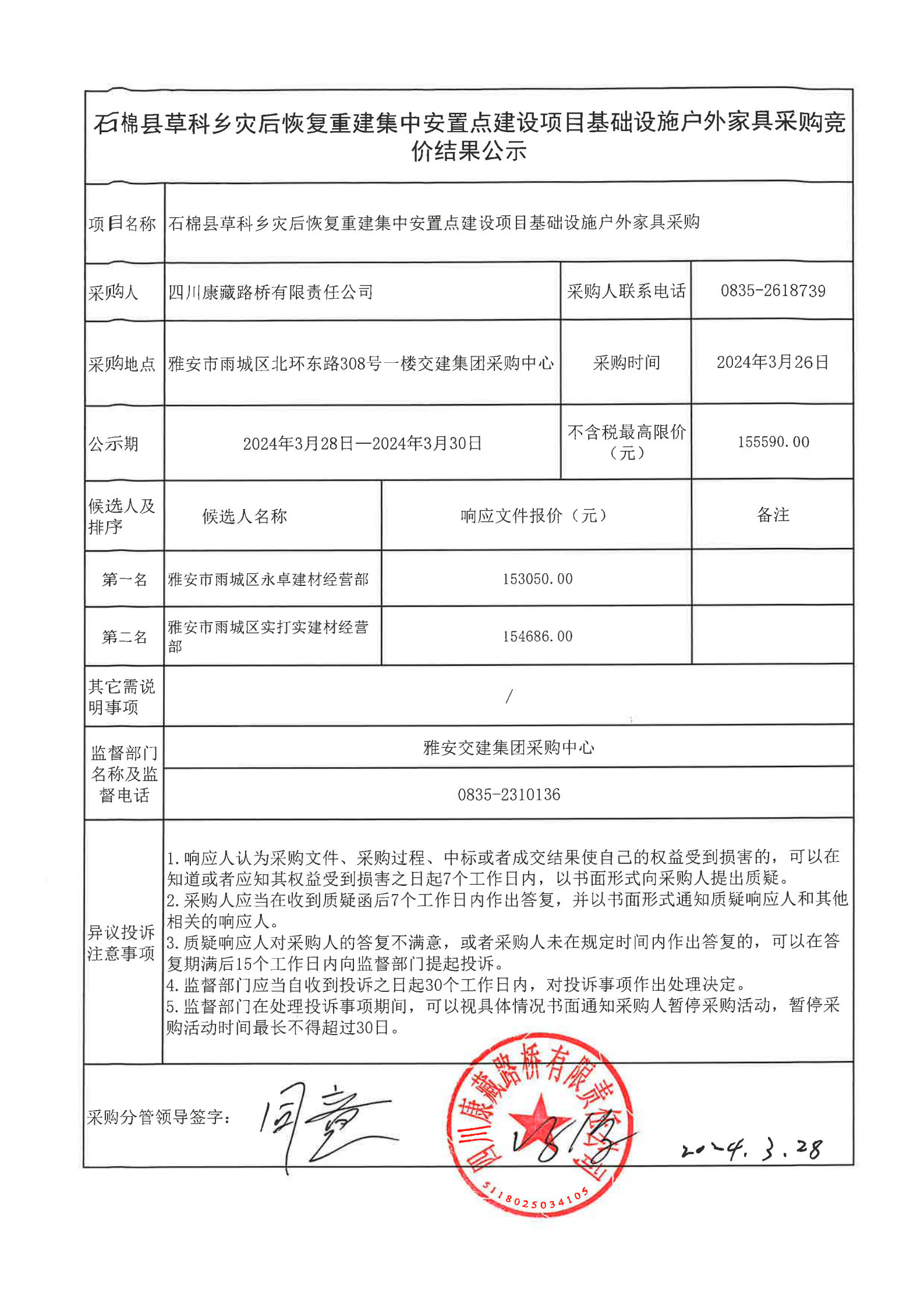 四川康藏路橋有限責任公司石棉縣草科鄉(xiāng)災后恢復重建集中安置點建設項目基礎設施戶外家具采購競價結果公示