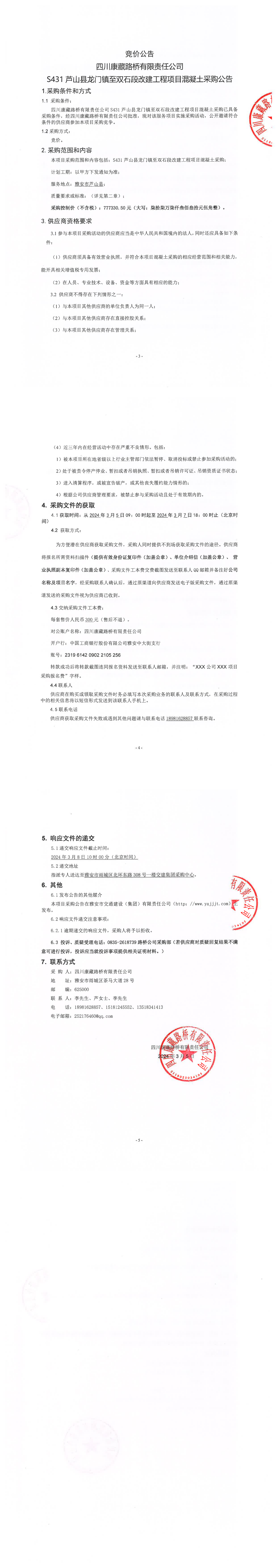 四川康藏路橋有限責(zé)任公司S431蘆山縣龍門鎮(zhèn)至雙石段改建工程項(xiàng)目混凝土采購(gòu)公告