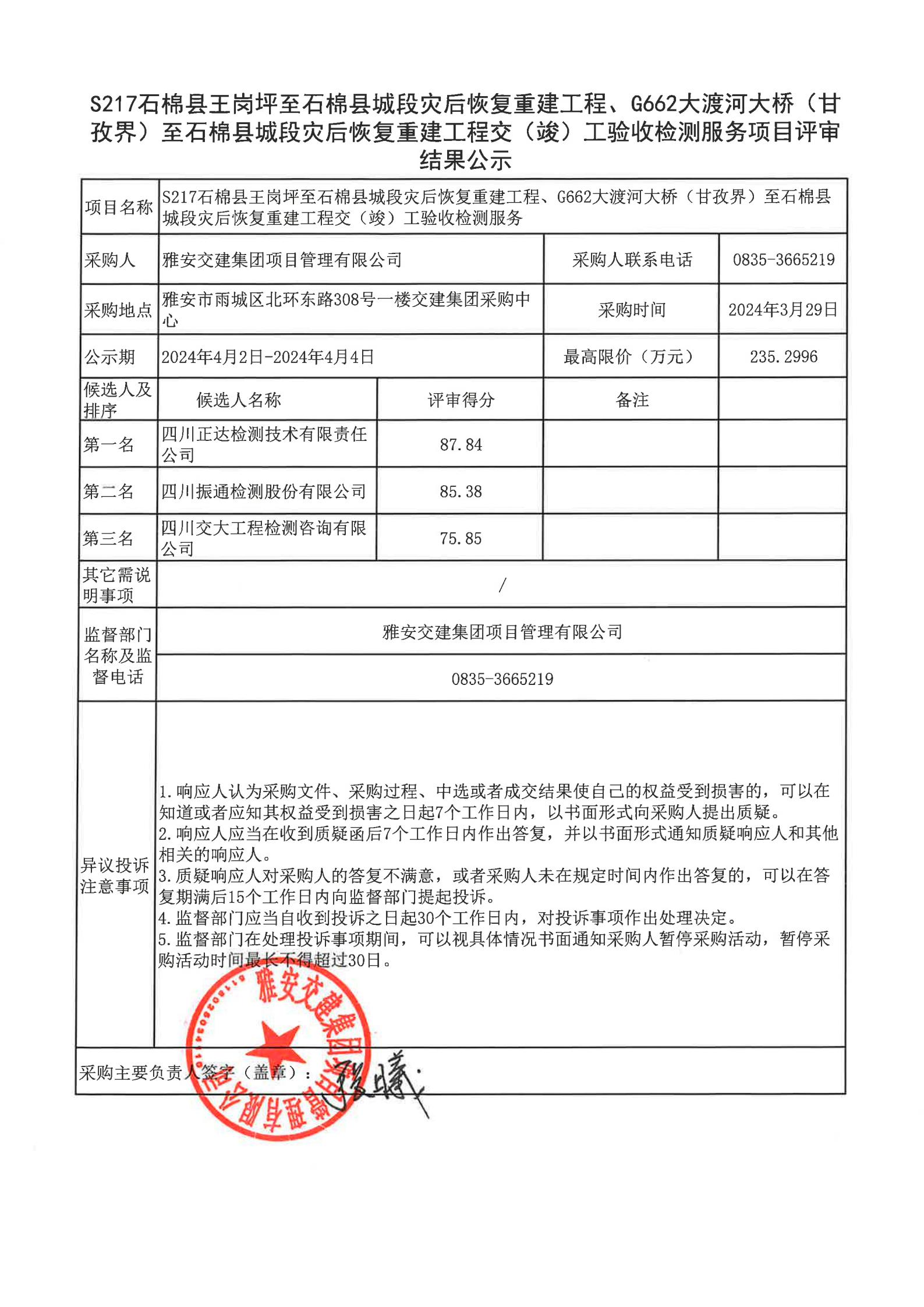 雅安交建集團項目管理有限公司S217石棉縣王崗坪至石棉縣城段災后恢復重建工程、G662大渡河大橋(甘孜界)至石棉縣城段災后恢復重建工程交(竣)工驗收檢測服務項目評審結果公示