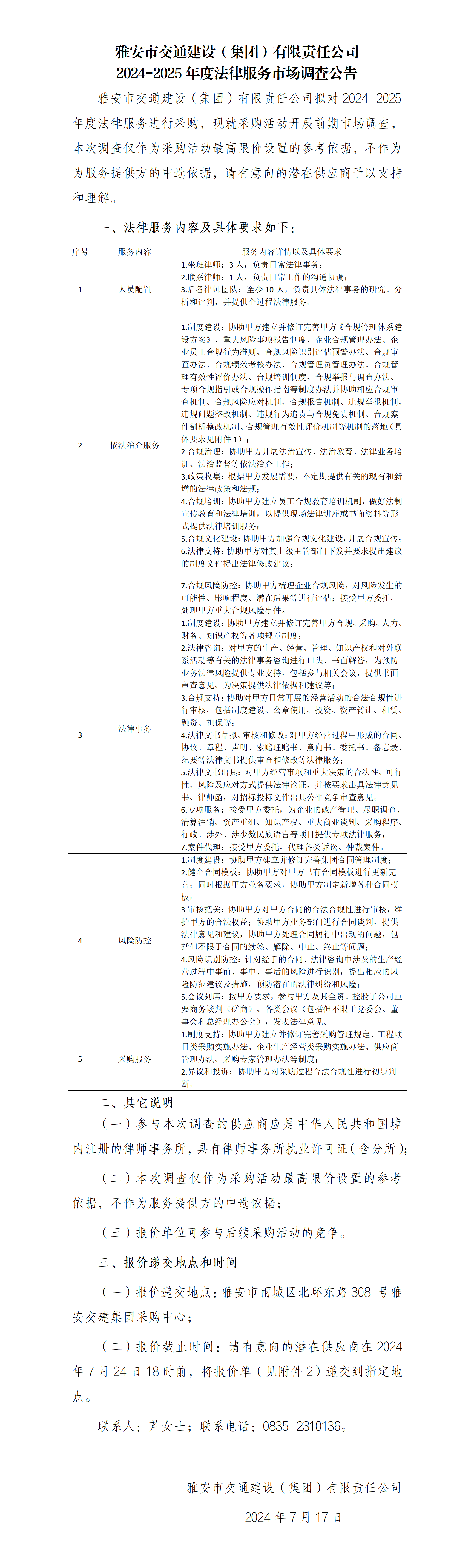 雅安市交通建設(shè)(集團)有限責任公司2024-2025年度法律服務(wù)市場調(diào)查公告