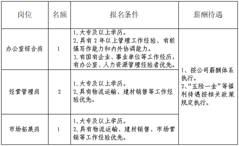 雅安交建集團運通貿易有限公司是雅安市交通建設(集團)有限責任公司下屬子公司。主要從事普通貨運、建材銷售、供應鏈管理、貨運代理、貨運信息咨詢服務、倉儲配送服務等工作。現根據公司業(yè)務發(fā)展需要,決定招聘4名工作人員,現將有關事項公告如下: